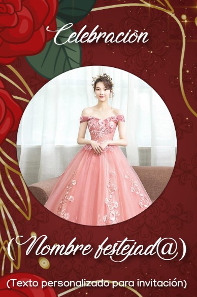 Invitaciones digitales para dulces 16 con rosas rojas, marco dorado, fondo vino brillante